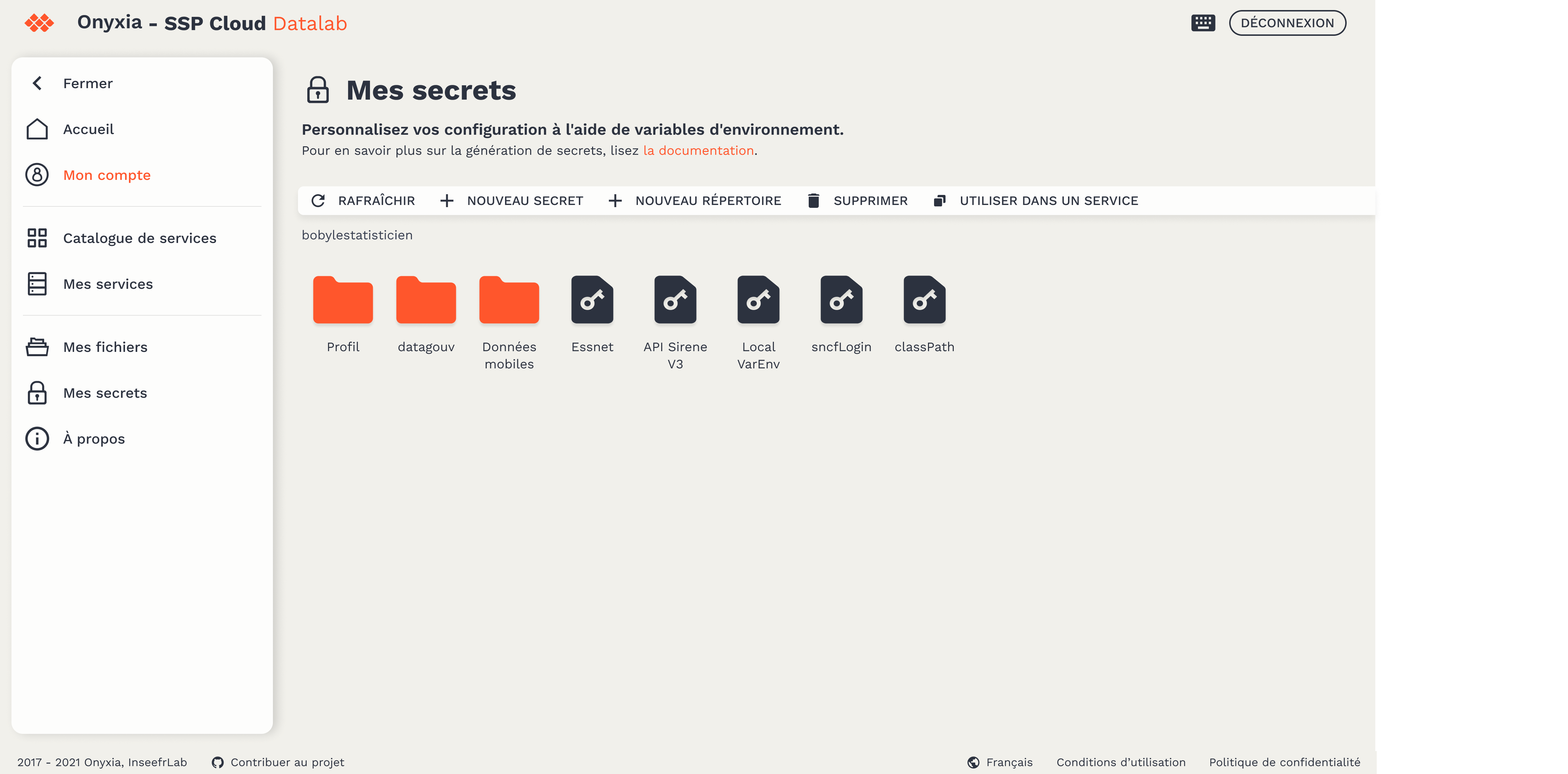 Sur la plateforme, les variables d'environnement sont des secrets écrits dans Vault (le coffre fort du Datalab) et sont chiffrées. Cela vous permet d'y stocker des jetons, des identifiants et des mots de passe. La page Mes secrets prends la forme d'un explorateur de fichiers où vous pouvez trier et hiérarchiser vos variables dans des dossiers.