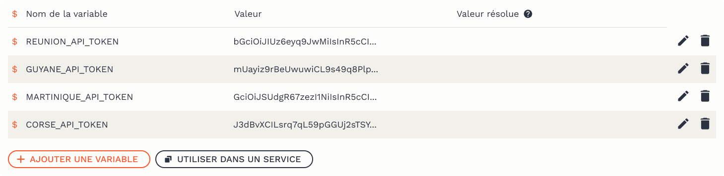 Au lancement d'un service, plusieurs variables d'environnement sont déjà injectées automatiquement — par exemple, les tokens d'accès à GitHub et MinIO.